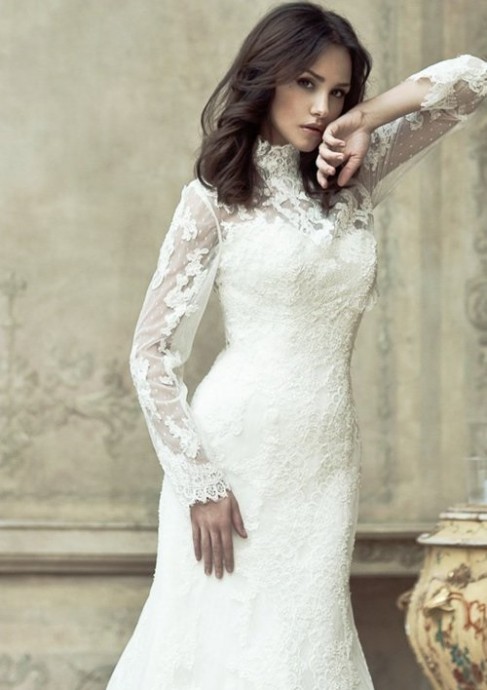 Если свадьба намечена в холодное время года, то невесте нужно выбирать между изысканным закрытым платьем или накидкой. Если девушка предпочитает выглядеть необычно и быть непохожей на других, то она может надеть закрытое свадебное платье. Модель, сделанная из блестящего шелка, атласа, кружева, идеально облегает фигуру и выглядит сногсшибательно.